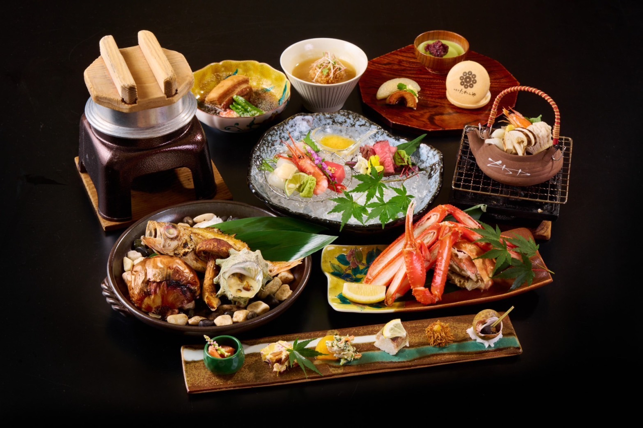 山中温泉は霊峰白山と極寒の日本海に挟まれ、美味しい食材に恵まれた土地にあります。冬の味覚「かに」をはじめとした北陸の鮮魚や、甘みたっぷりの加賀野菜。